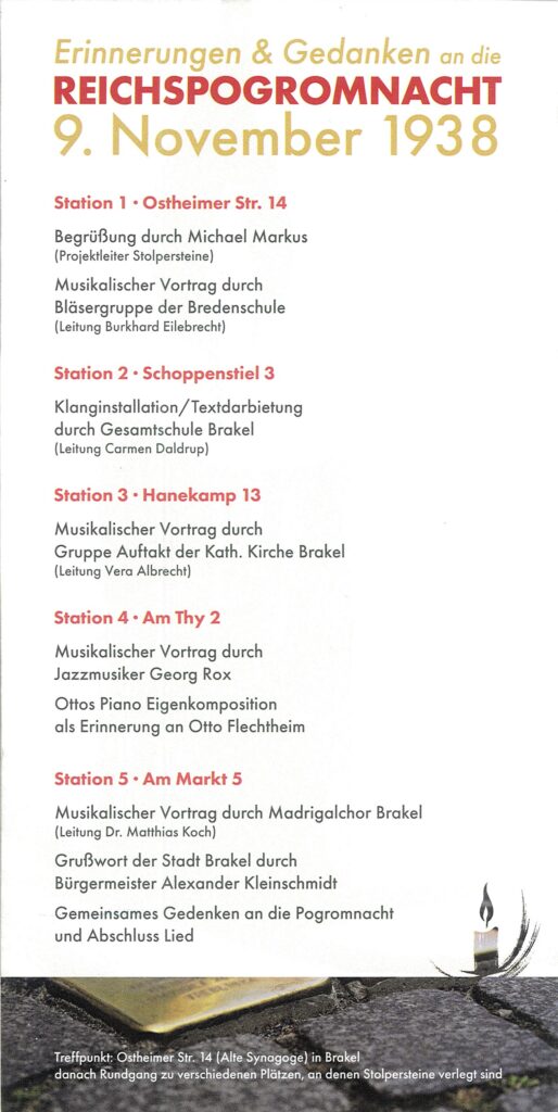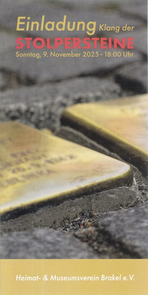 Die Einladung zum Rundgang mit dem Thema “Klang der Stolpersteine” hat der Heimat- und Museumsverein Brakel e.V. ausgesprochen. Unter Projektleitung von Michael Markus sind in den vergangenen Jahren Stolpersteine zum Gedenken an vertriebene Mitbürgerinnen und Mitbürger aus Brakel vor deren ehemaligen Wohnhäusern im Straßenpflaster verlegt worden. Mitbürgerinnen und Mitbürger, zumeist jüdischen Glaubens, die aufgrund politischen und gesellschaftlichen Drucks des Nazi-Regimes nicht mehr in unserer Mitte bleiben konnten.