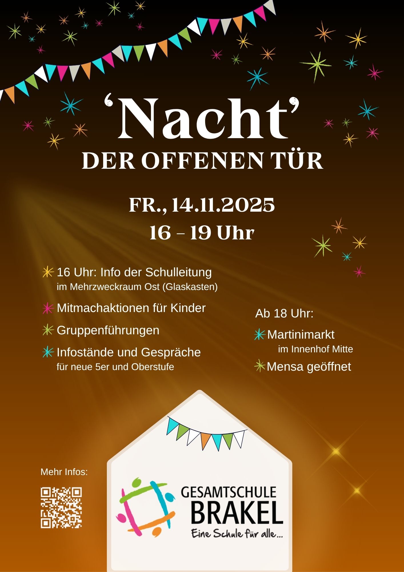 Am Freitag, 14.11.2025 ab 16 Uhr öffnen wir die Schule für Alle, um uns kennen zu lernen. Auch unsere gymnasiale Oberstufe freut sich über viele interessierte Besucherinnen und Besucher. Nach einem Rundgang durch die Schule mit vielen Infoständen und Mitmach-Aktionen lockt ab 18 Uhr der Martinimarkt im “Innenhof Mitte” mit duftenden Leckereien und liebevoll vorbereiteten Marktständen. Wir freuen uns auf einen schönen Abend!