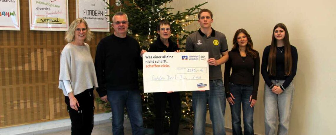Während der “Nacht der offenen Tür” und des vorweihnachtlichen Martinimakts hatten die Klassen schuleigene Erzeugnisse verkauft, sowie auch Getränke und Speisen angeboten. Aus diesem Erlös konnte die Schule nun mit großer Freude eine Spende in Höhe von 1.380,00 EUR übergeben den Verein “Caritas Konferenz – Tischlein deck Dich, Brakel e.V.”. Entgegen genommen hat den Spendenscheck die erste Vorsitzende des Vereins, Frau Gabriele Elbracht-Hülseweh. Sie freute sich sichtlich, da mit diesem Geld wirksame Hilfe an Bedürftige direkt hier vor Ort geleistet werden kann. Sie dankte der Schule, insgesondere den engagierten Schülerinnen und Schülern, daher sehr herzlich für ihren tatkräftigen Einsatz und die großzügige Spende.