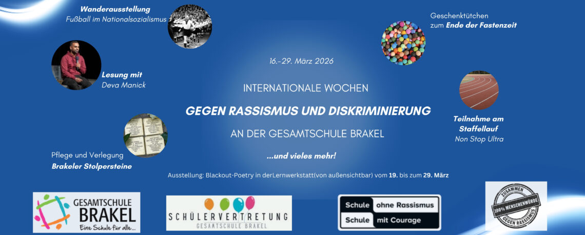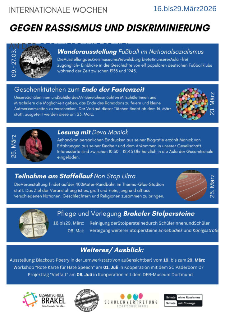 Die Internationalen Wochen gegen Rassismus nimmt die Gesamtschule Brakel zum Anlass, erneut zahlreiche Aktionen und Projekte zu veranstalten. Die Schülerinnen und Schüler sind dazu einladen, sich aktiv mit Themen wie Diskriminierung, Erinnerungskultur und gesellschaftlichem Zusammenhalt auseinanderzusetzen. Auf diese Weise setzt die Schule vom 16. bis 29. März 2026 ein deutliches Zeichen für Vielfalt, Respekt und ein friedliches Miteinander.