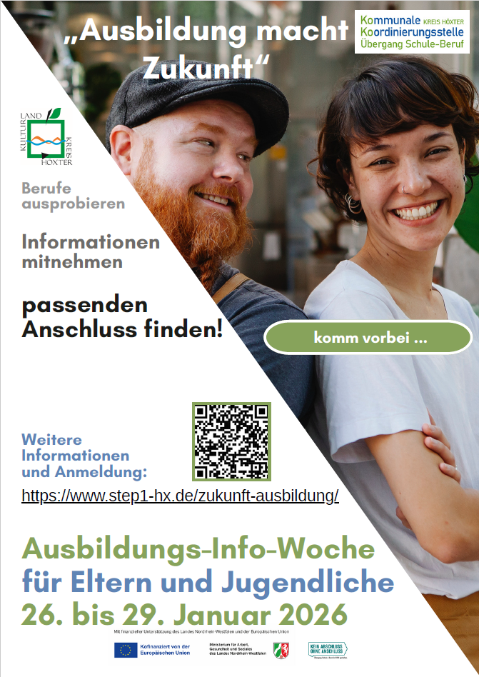 Unter dem Motto „Ausbildung macht Zukunft“ lädt die Kommunale Koordinierungsstelle Übergang Schule-Beruf vom 26. bis 29. Januar 2026 gemeinsam mit den Beteiligten zu praxisnahen Veranstaltungen im gesamten Kreisgebiet ein.