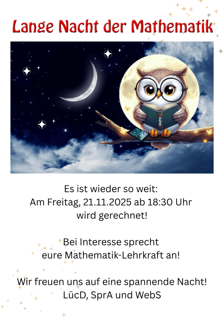 21.11.2025 ab 18 Uhr: Lange Nacht der Mathematik. Es handelt sich um eine bundesweite Aktion und wir machen wieder mit! Der Anmeldezeitraum beginnt nach den Herbstferien. Mehr Infos: Hier.