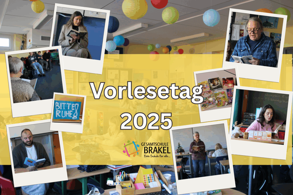 Auch an unserer Schule wurde der Vorlesetag für die Schülerinnen und Schüler der Jahrgänge 5 und 6 wieder durchgeführt: Die Kinder durften sich Kuschelsocken mitbringen und es sich im Klassenzimmer gemütlich machen, dann wurde für zwei Stunden inkl Pause ganz gemütlich zeitgenössische Kinderliteratur vorgelesen. Organisiert und initiiert wurde der Tag von Miriam Scholz. Sie bedachte im Anschluss auch alle Vorlesenden mit einer Urkunde und einem süßen Dankeschön. Besonders schön: Auch Schülerinnen und Schüler unserer Oberstufe engagierten sich und bereicherten die Gruppe der Vorlesenden. Zudem wurde der Vorlesetag für einen Mini-Schüleraustausch genutzt: Während unsere Klasse 5e in den Genuss einer Vorlesestunde an der Grundschule Brakel gekommen ist, erhielt unsere Schule Besuch von einer Klasse der Schulen der Brede. Gebannt lautschten die kleinen Besucherinnen und Besucher der vorgetragenen Geschichte.